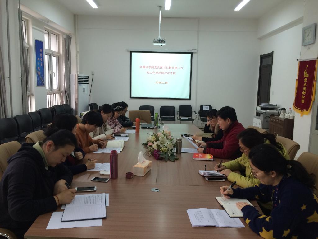 2018年1月18日下午,外国语学院党总支于博雅楼A403会议室召开2017年度党支部书记抓党建述职评议会议。会议由党总支书记董玉新主持,党总支成员,各党支部委员参加。