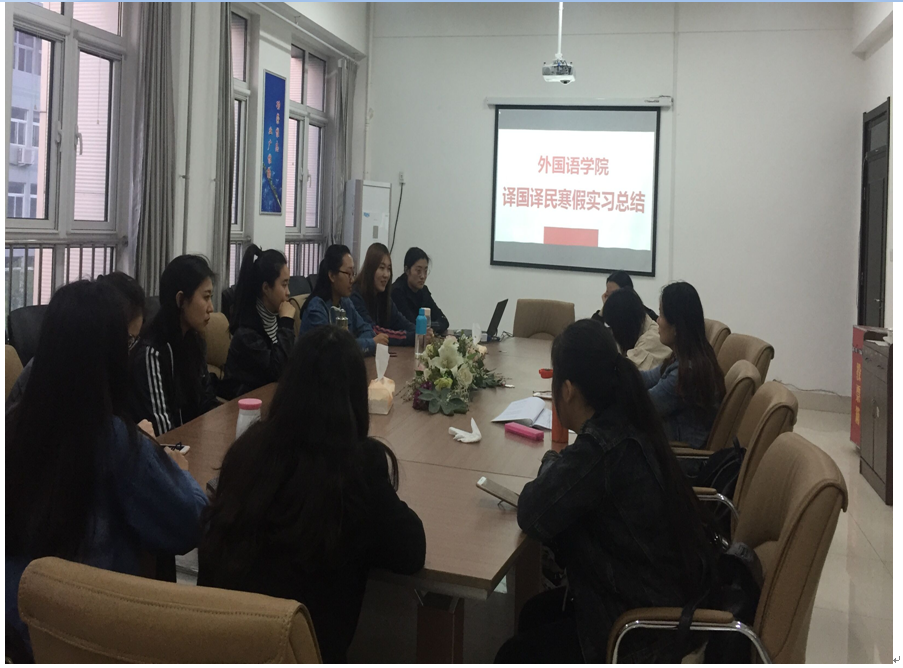 4月16日晚,外国语学院英语本科教研室在博雅楼A403会议室组织召开了译国译民寒假实习总结交流会。外国语学院副院长、英语本科教研室主任曹翠红主持会议,英语本科教研室刘瑶老师以及英语17专升本、英语16本的14名学生代表参加了总结交流会。