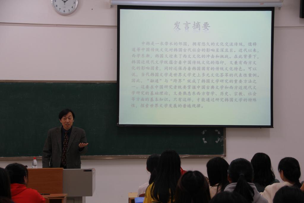 东亚文化论坛是由外国语日韩语言文学科研团队主办,日语和韩语师生共同参与。作为国内外韩国学研究的知名学者,牛林杰教授来我校进行讲座,不仅为团队以后的项目研究有指导意义,对我校韩语专业的学生的发展也起到了鼓舞和指导作用。