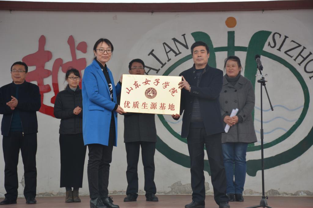 授牌仪式在泰安四中的大操场举行,由泰安四中副校长刘延顺主持。王钰校长致欢迎词,对我校的“优质生源基地”建设工作表示肯定和欢迎,并强调了合作关系对两所学校的重要促进作用。赵淑容院长代表我校发言,她从四个问题着手,以提问和解答的形式介绍了学校、专业设置和学院专业及特色。活泼的发言形式,得到了在场高中生的共鸣。之后在泰安四中的会议室举行了签约仪式并座谈。