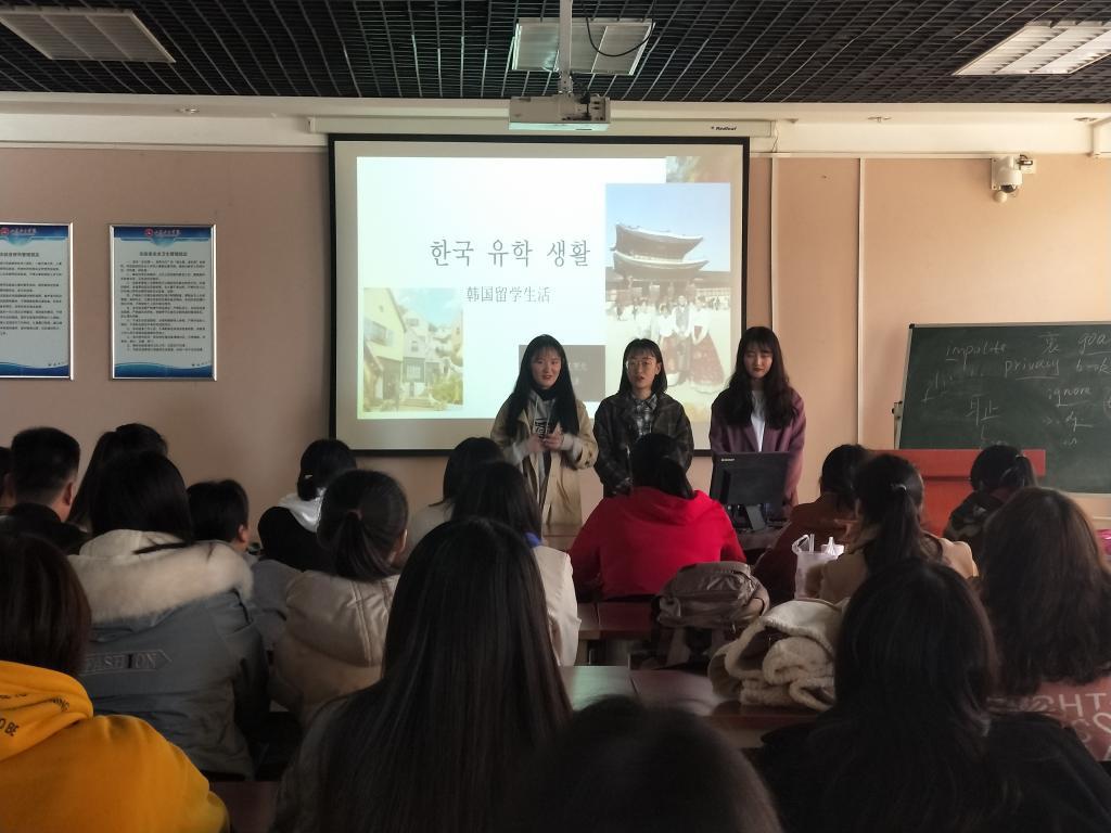 交流会分两部分进行。首先,国际交流处李处长做了主题演讲。介绍了学校与韩国高校的国际交流现状,并对2019年的国际交流计划及变化进行了讲解,鼓励学生积极参与交流项目,提高国际化视野及跨文化交际能力。其次,6名交流生通过图片的形式,分享了在韩国的学习生活体验和所见所闻并介绍了韩国交流的花费及收获,并建议有出国意愿的同学要提早做准备,努力提高语言水平和学业成绩。最后,6名交流生对同学们的一些疑惑予以认真仔细地解答。