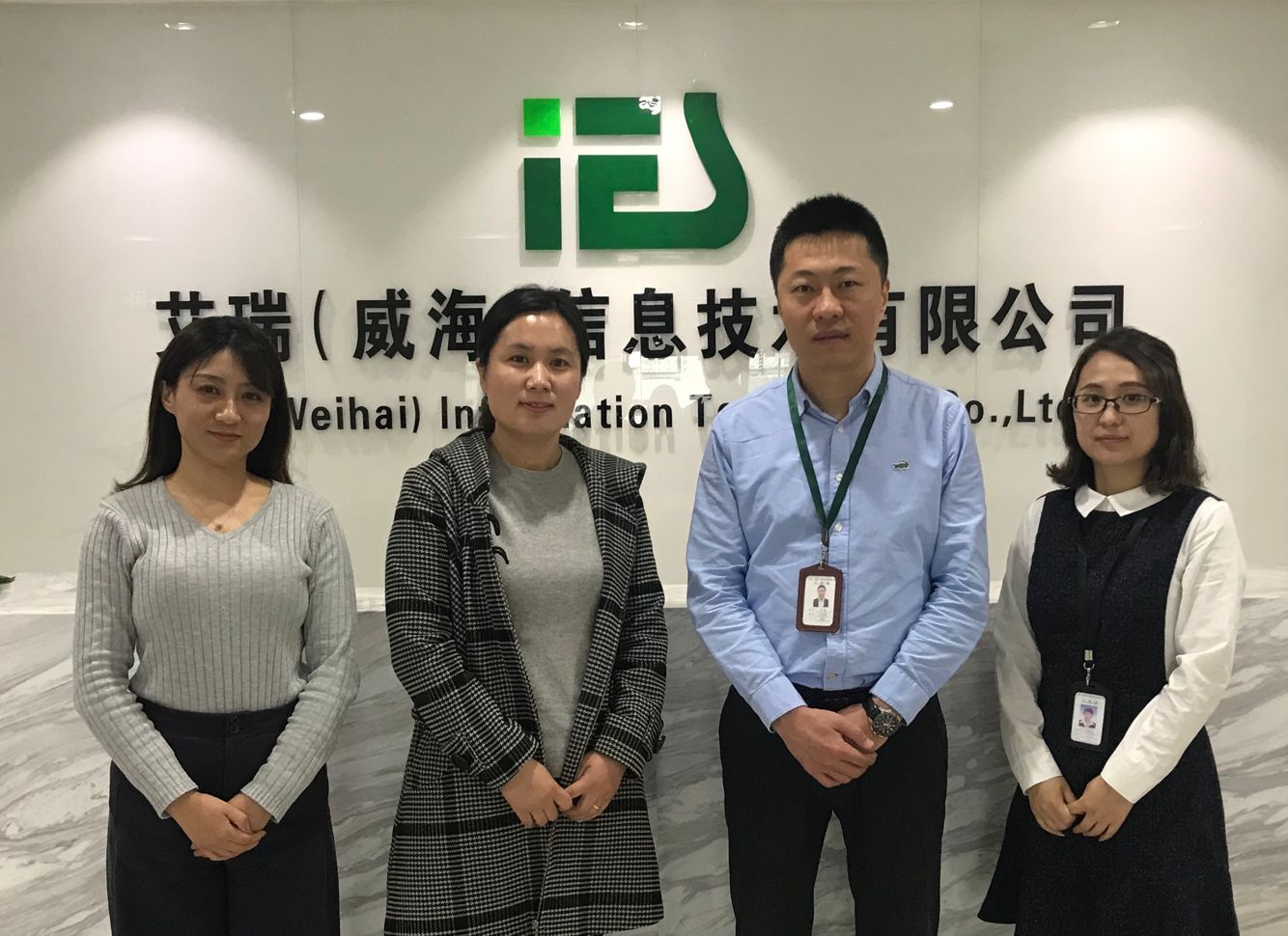 4月16日上午,外国语学院副院长曹翠红及相关专业负责人前往艾瑞(威海)信息技术有限公司,就双方合作等事宜与总经理邓烁及企业相关负责人进行了友好洽谈和深入探讨,并举行了实习就业双基地签约仪式?;岷螅茉撼ひ恍胁喂哿斯綛PO中心并看望了3名日语专业实习学生。