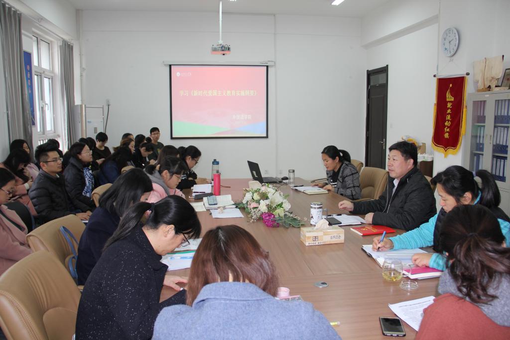 根据学校关于“不忘初心,牢记使命”主题教育的有关要求,11月21日下午,外国语学院党总支在博雅楼A403召开《中国共产党第十九届中央委员会第四次全体会议公报》《新时代爱国主义教育实施纲要》学习会议。党总支书记董玉新主持,全体教师参加了会议。