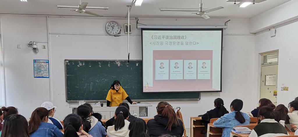 韩语专业副教授孙虹老师确定主题为“读时政 学韩语”。孙虹老师以轻松活泼的韩国娱乐文化为切入点激发起学生们的学习乐趣,引导学生作为外语学习者要了解对象国的经济、历史等有深度的内容,用外语讲好中国故事。孙虹老师重点带领大家一起用中韩双语学习了《习近平谈治国理念(第三卷)》中习近平总书记在第十三届全国人民代表大会上的讲话内容,并结合以习近平同志为总书记的党中央的治国理念和执政方略对其进行了深入的分析探讨。最后,孙虹老师寄语学生不仅要具备广博知识、国际视野,更要有家国情怀,社会责任感,在激扬青春的过程中书写无愧于时代的壮丽篇章。