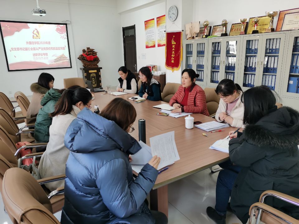 2021年1月11日下午,外国语学院党总支于博雅楼A403会议室召开2020年度党支部书记履行全面从严治党责任和抓基层党建述职评议考核会议?;嵋橛傻匙苤Ц笔榧枪⒒鞒?,党总支成员,各党支部书记参加。