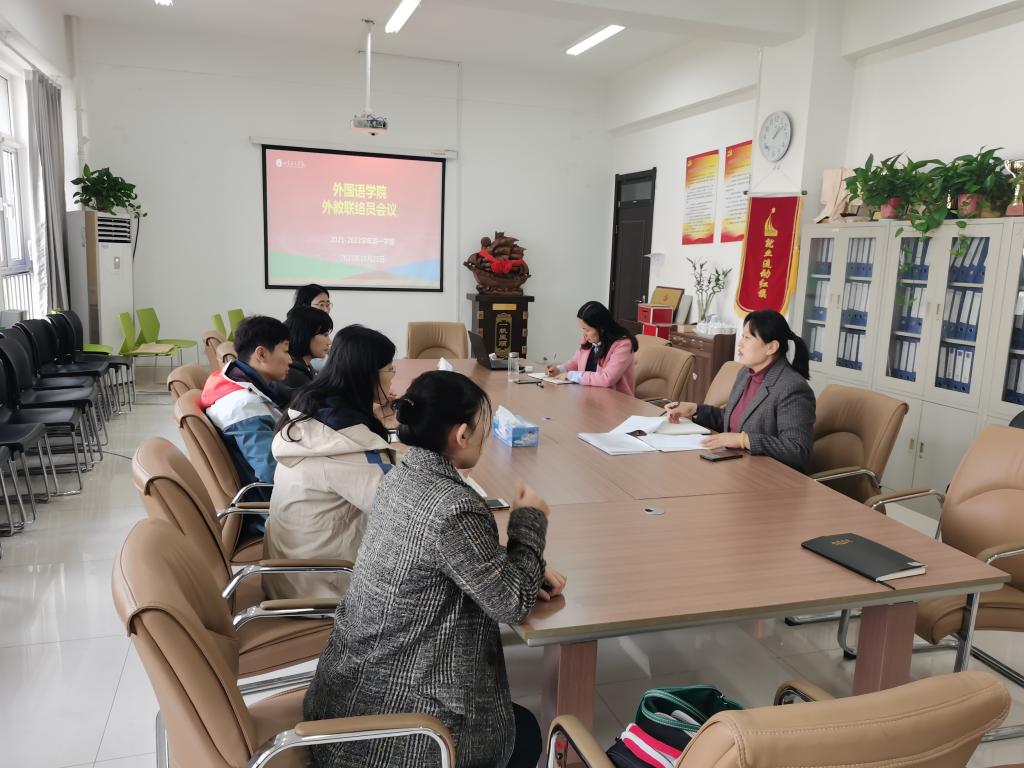 10月21日下午,外国语学院在博雅楼A403举行2021-2022学年第一学期外教联络员会议。学院党委副书记耿华主持会议,学院分管教学副院长、各专业外教联络员及教务员参加会议。