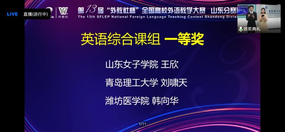 在刚刚落下帷幕的第十三届“外教社杯”全国高校外语教学大赛山东赛区的决赛中,我校外国语学院王欣老师以第二名的优异成绩荣获英语综合课组一等奖,吴兆丽老师带领的教学团队获得英语思政微课组二等奖。