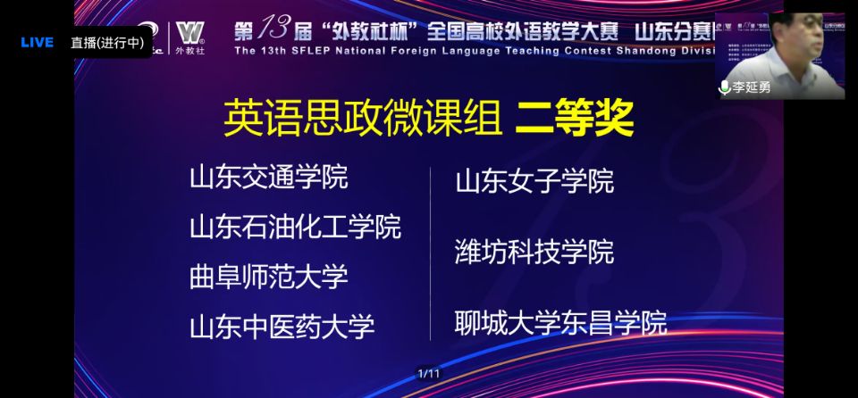 “外教社杯”全国高校外语教学大赛是我国外语界最具影响力的外语教学专项赛事,已成功举办过十二届。第十三届“外教社杯”全国高校外语教学大赛山东赛区比赛由山东省教育厅高等教育处指导,山东省本科教育大学外语教学指导委员会和上海外语教育出版社联合主办,青岛理工大学承办。山东赛区比赛共设英语综合课组、英语(视)听说课组、日语综合课组和英语思政微课组四个组别,共有来自全省62所高校335名教师和49个团队参赛。经过初赛的激烈竞争,王欣老师成功晋级综合组省赛前20名,吴兆丽老师及团队成员刘维绰、高李莹、陈琨、杨玉珊、巩茗珠老师所提交的微课作品A Real Mother也成功晋级,最终均取得优异成绩。